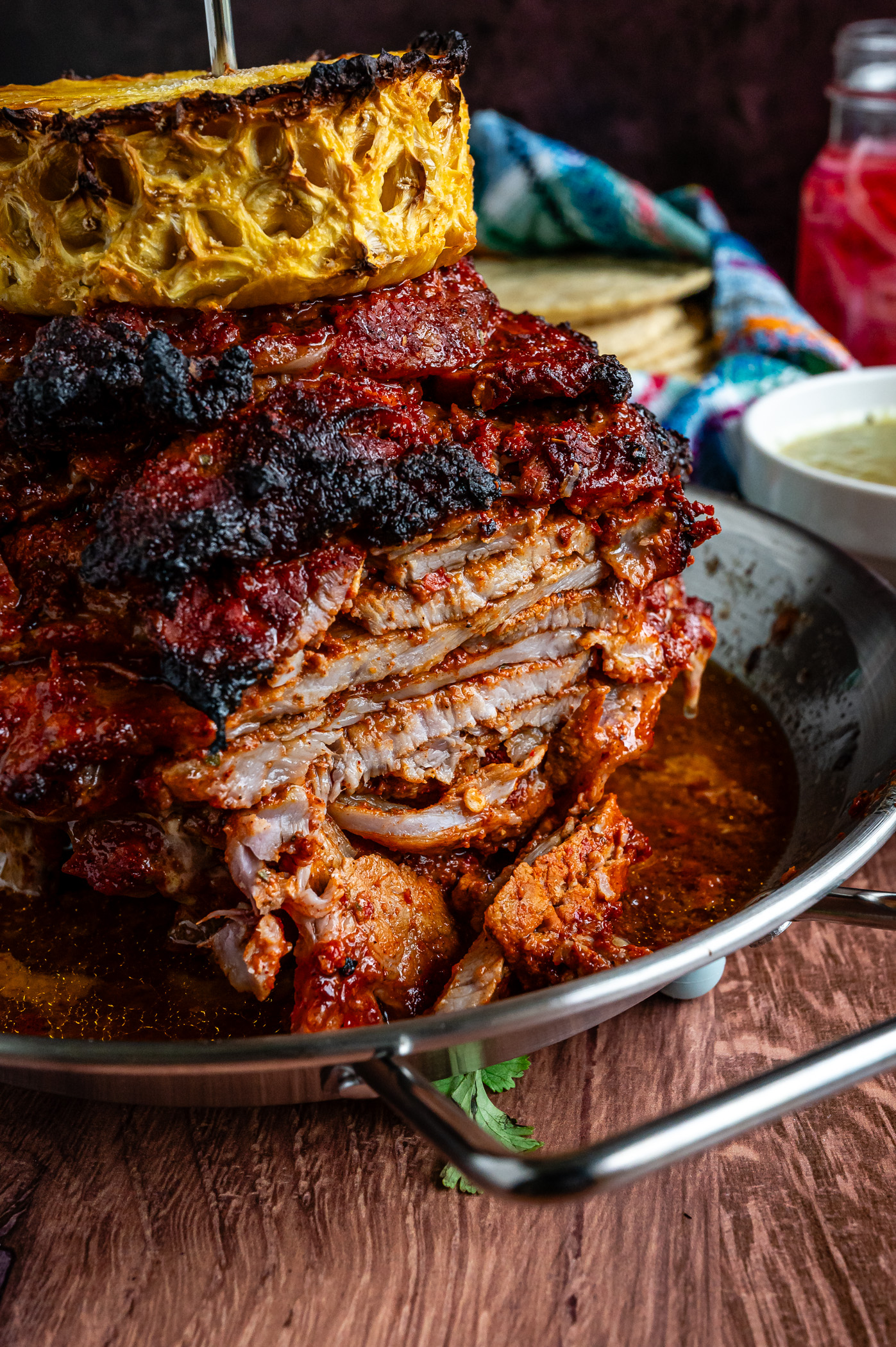 Surprise your family on Taco Tuesday with this amazing Pork Al Pastor recipe. You can easily make your favorite tacos at home, and it's easier than you think. Thin-sliced pork shoulder marinated in a tangy mixture of dried chiles, orange juice, and spices is baked until the edges are slightly charred to make the most mouth-watering taco meat!