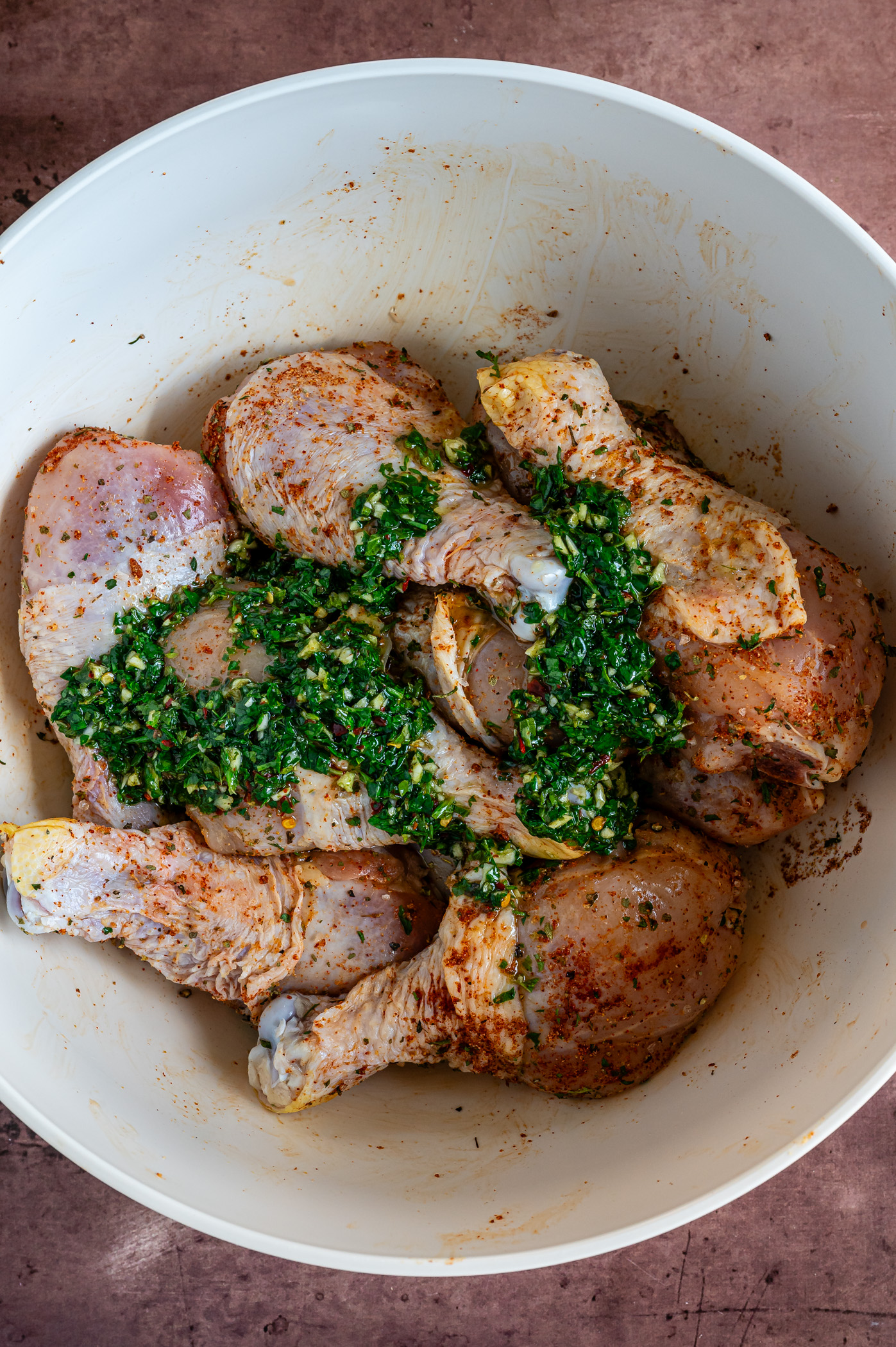 - Place the dry drumsticks in a large bowl and add the herbs, spices, salt, pepper, and chimichurri. Mix until all the drumsticks are well seasoned. Cover with plastic wrap and refrigerate at least 30 to 2 hours.