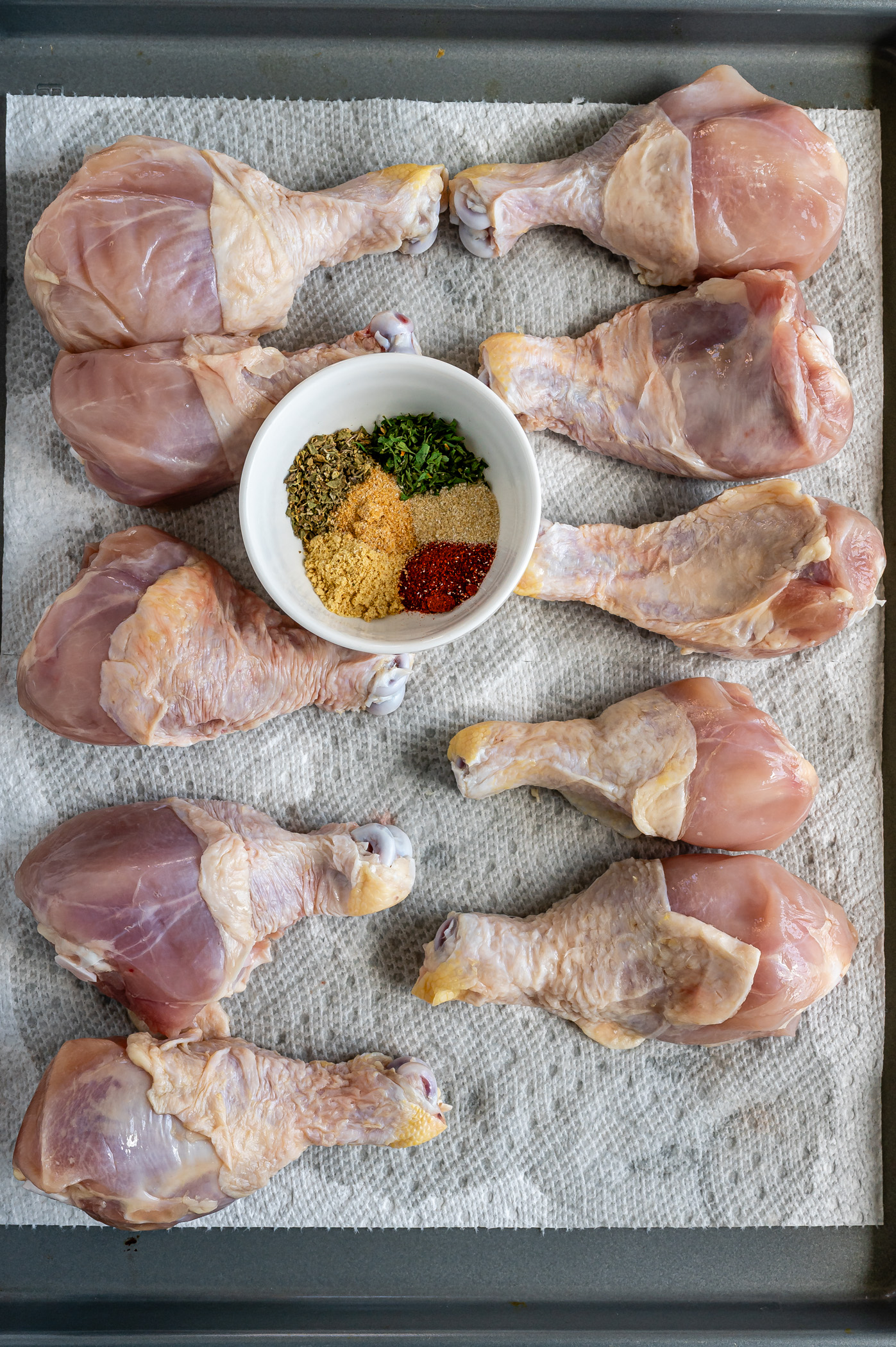 - Pat dry the chicken drumsticks with paper towels so the seasonings can properly adhere to them.